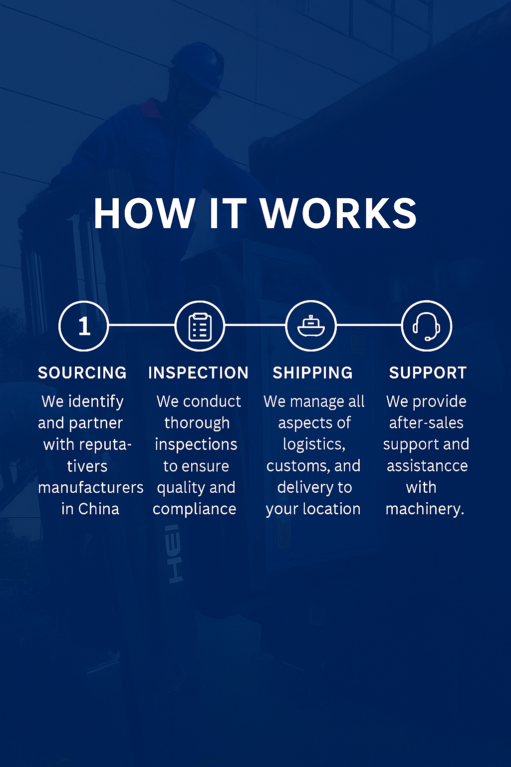 We begin by understanding your machinery needs, then source from verified manufacturers with a track record of reliability. Every product undergoes strict quality checks before shipment. We manage all logistics—freight, customs, and final delivery—and continue to support you after delivery with spare parts and technical assistance.